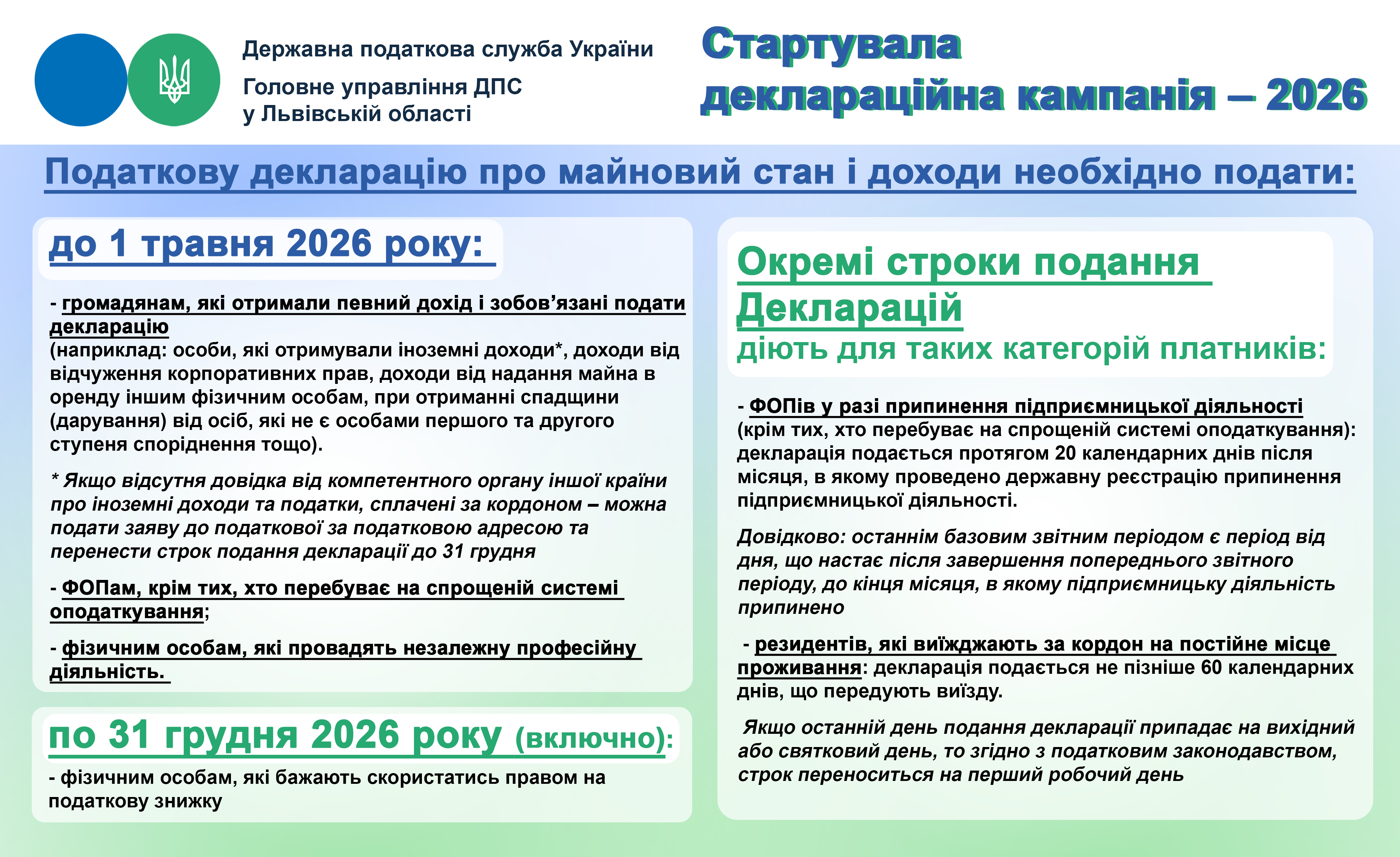 Стартувала деклараційна кампанія - 2026: податкову декларацію про майновий стан і доходи необхідно подати до 1 травня 2026 року