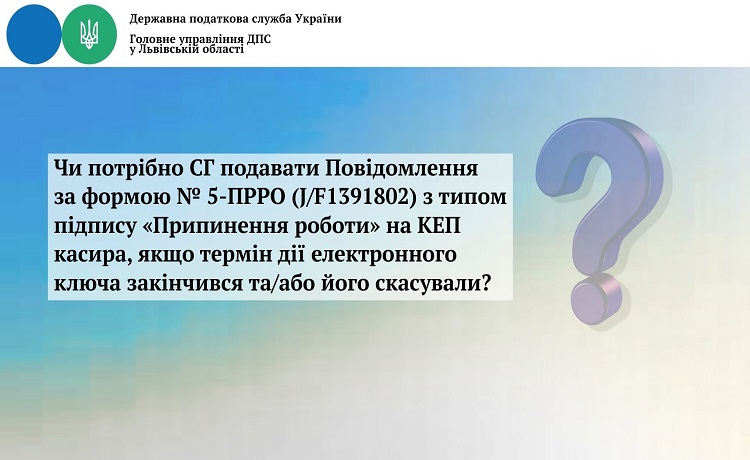 - Чи потрібно СГ подавати Повідомлення за формою № 5-ПРРО (J/F1391802) з типом підпису «Припинення роботи» на КЕП касира, якщо термін дії електронного ключа закінчився та/або його скасували?