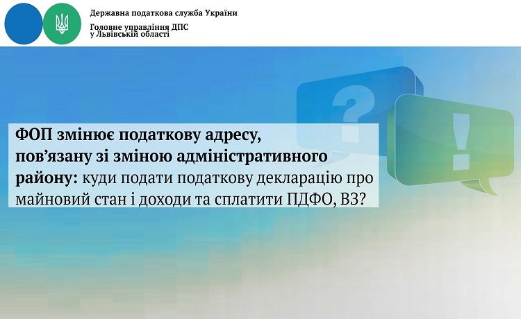 Головне управління ДПС у Львівській області звертає увагу суб’єктів господарювання, що у разі зміни податкової адреси, пов’язаної зі зміною адміністративного району, ФОП на загальній системі оподаткування подає податкову декларацію про майновий стан і доходи з додатками до контролюючого органу за новим місцезнаходженням, а сплачує податок на доходи фізичних осіб та військовий збір до відповідних бюджетів за попереднім місцезнаходженням до закінчення поточного бюджетного року.