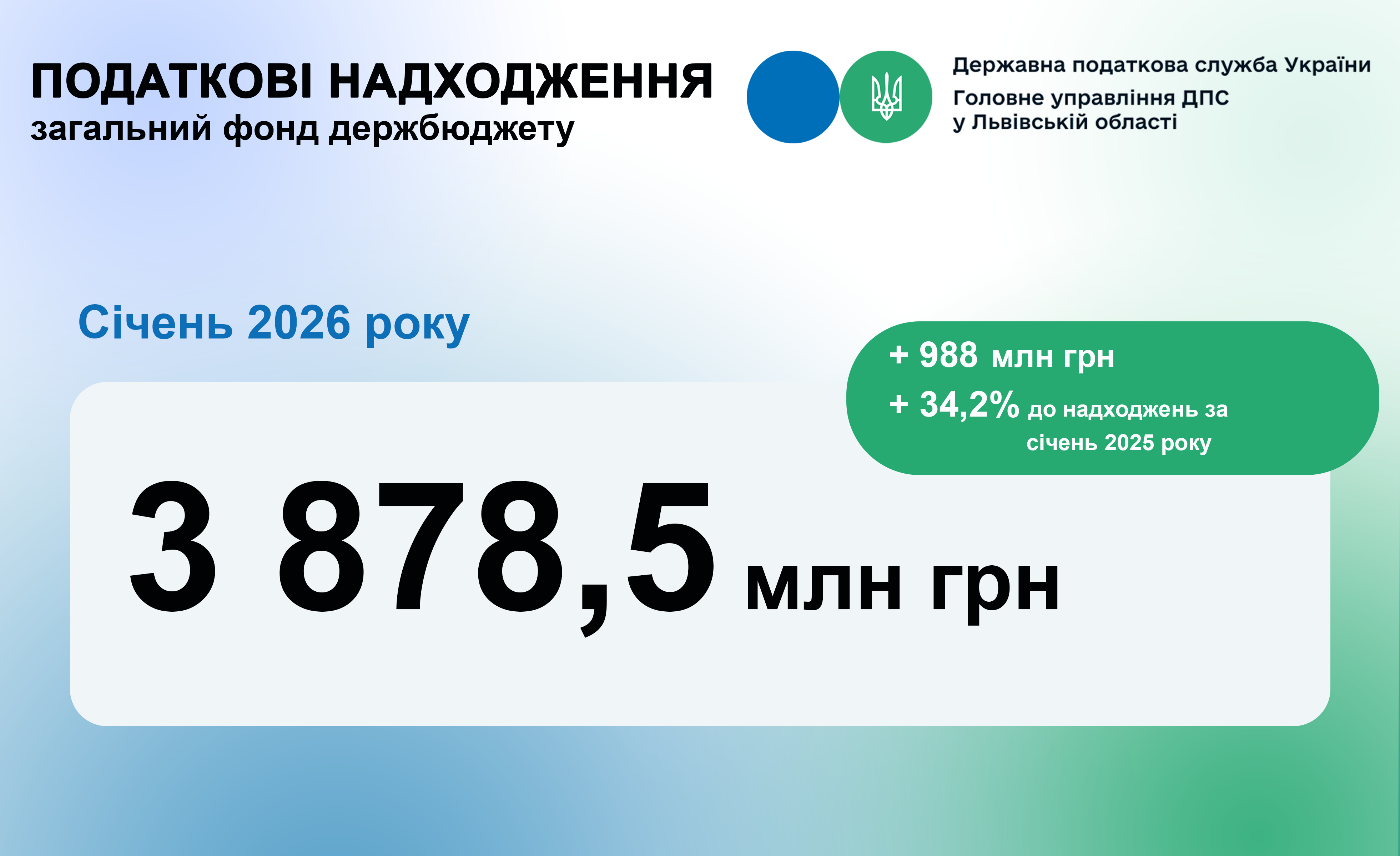 У січні 2026 року Головним управлінням ДПС у Львівській області до загального фонду державного бюджету зібрано 3 878,5 млн грн податків, зборів, інших обов’язкових платежів. Порівняно з січнем 2025 року збір платежів до загального фонду державного бюджету збільшився на 34,2% або на 988,0 млн гривень. Про це повідомив начальник Головного управління ДПС у Львівській області Микола Никитюк.