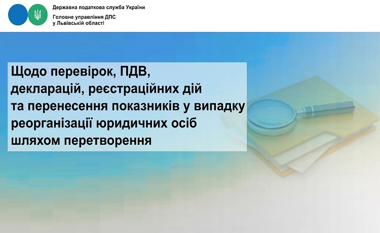 Щодо перевірок, ПДВ, декларацій, реєстраційних дій та перенесення показників у випадку реорганізації юридичних осіб шляхом перетворення