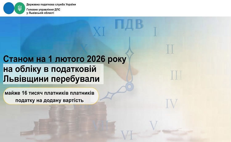 Станом на 01 лютого 2026 року на обліку в податковій Львівщини перебували майже 16 тисяч платників податку на додану вартість