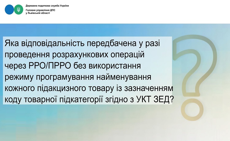 До суб’єктів господарювання, які здійснюють розрахункові операції, за рішенням відповідних контролюючих органів застосовуються фінансові санкції у розмірі триста неоподатковуваних мінімумів доходів громадян – у разі проведення розрахункових операцій через РРО та/або ПРРО без використання режиму програмування найменування кожного підакцизного товару із зазначенням коду товарної підкатегорії згідно з УКТ ЗЕД, ціни товару та обліку його кількості.