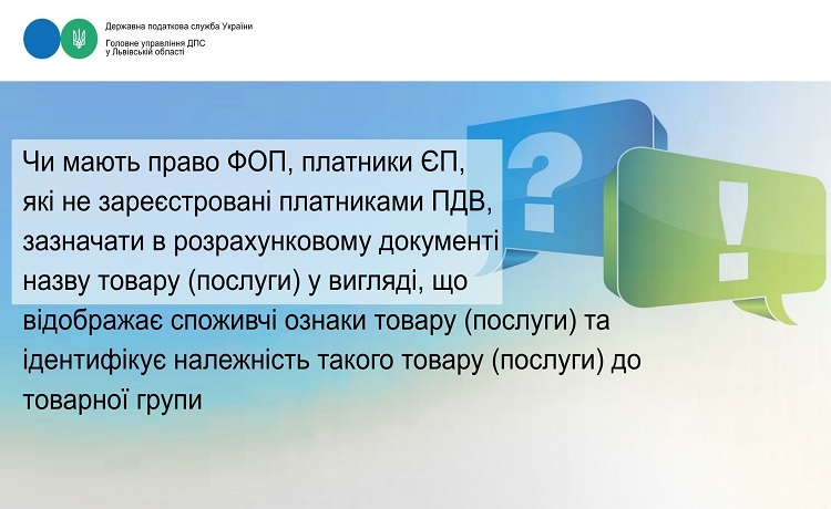 Відповідно до Закону України «Про застосування реєстраторів розрахункових операцій у сфері торгівлі, громадського харчування та послуг» із змінами та доповненням (далі – Закон № 265) фізичні особи – підприємці, які є платниками єдиного податку та не зареєстровані платниками податку на додану вартість, при продажу товарів (крім підакцизних товарів, технічно складних побутових товарів, що підлягають гарантійному ремонту, лікарських засобів, виробів медичного призначення, ювелірних та побутових виробів з дорогоцінних металів, дорогоцінного каміння, дорогоцінного каміння органогенного утворення та напівдорогоцінного каміння) або наданні послуг мають право в розрахунковому документі зазначати назву товару (послуги) у вигляді, що відображає споживчі ознаки товару (послуги) та ідентифікує належність такого товару (послуги) до товарної групи чи послуги.