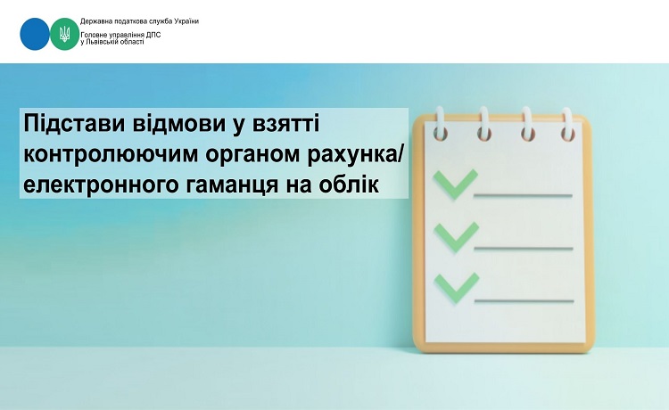 Відповідно до п. 1 розд. ІІІ Порядку подання повідомлень про відкриття/закриття рахунків/електронних гаманців платників податків у банках, інших фінансових установах, небанківських надавачах платіжних послуг/емітентах електронних грошей до контролюючих органів, затвердженого наказом Міністерства фінансів України від 18.08.2015 № 721 (із змінами та доповненнями) (далі – Порядок № 721), підставами для відмови у взятті контролюючим органом рахунка/електронного гаманця на облік є: