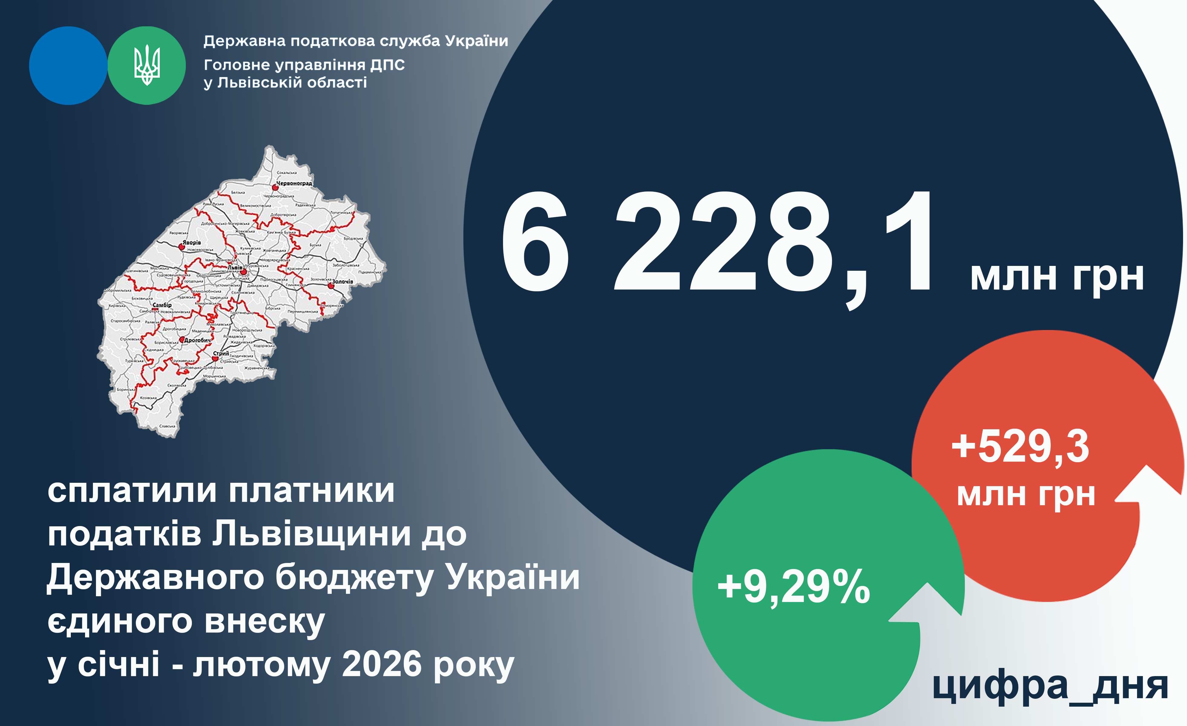 У січні-лютому 2026 року фактичні надходження єдиного внеску на загальнообов'язкове державне соціальне страхування становили 6 228,1 млн гривень. Порівняно з січнем-лютим 2025 року надходження зросли на 9,29% або на 529,3 млн гривень.