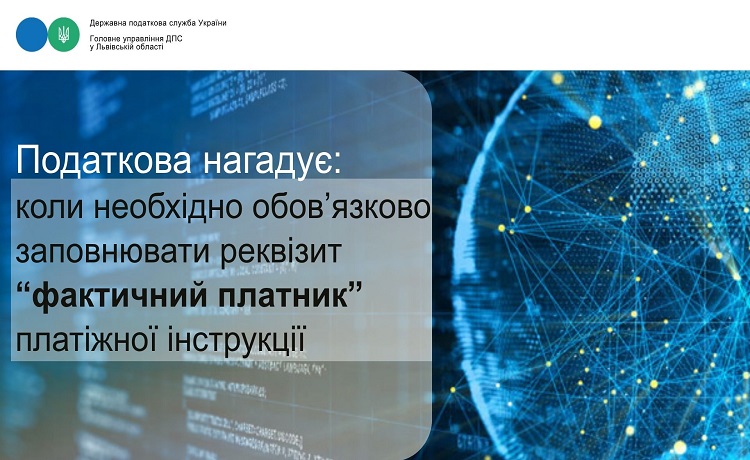 Головне управління ДПС у Львівській області звертає увагу громадян на те, що у випадках, коли платіжна операція ініціюється за іншу особу, необхідно обов’язково зазначити податковий номер та ПІБ того громадянина, податкові зобов’язання якого сплачуються, у реквізитах «Найменування фактичного платника» та «Код фактичного платника» платіжної інструкції при сплаті через мобільний додаток банку або термінал!
