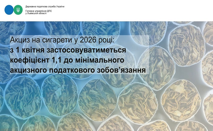 Головне управління ДПС у Львівській області нагадує. 3 1 квітня 2026 року сума акцизного податку на сигарети не може бути меншою за мінімальне податкове зобов’язання, помножене на коефіцієнт 1,1. Це пов’язано з показниками декларування акцизного податку виробниками та імпортерами сигарет за 2025 рік. Відповідно до Податкового кодексу, якщо частка акцизу у ціні за попередній рік менше 60 %, до мінімального податкового зобов’язання застосовується коефіцієнт 1,1. У 2025 році: - загальна сума податкових зобов’язань з акцизного податку на сигарети (включаючи акцизний податок з роздрібної торгівлі) – 3 846,3 грн на 1000 штук; - середньозважена роздрібна ціна продажу сигарет (включаючи акцизний податок з роздрібної торгівлі) – 6 537,0 грн на 1000 штук; - частка загальної суми податкових зобов’язань у середньозваженій роздрібній ціні – 58,8 %. Оскільки у 2025 році частка акцизного податку в ціні сигарет становила 58,8 %, з 1 квітня по 31 грудня 2026 рокукоефіцієнт1,1 зобов’язані застосовувати виробники та імпортери тютюнових виробів за кодами УКТ ЗЕД: - 2402 20 90 10 сигарети без фільтра; - 2402 20 90 20 сигарети з фільтром.