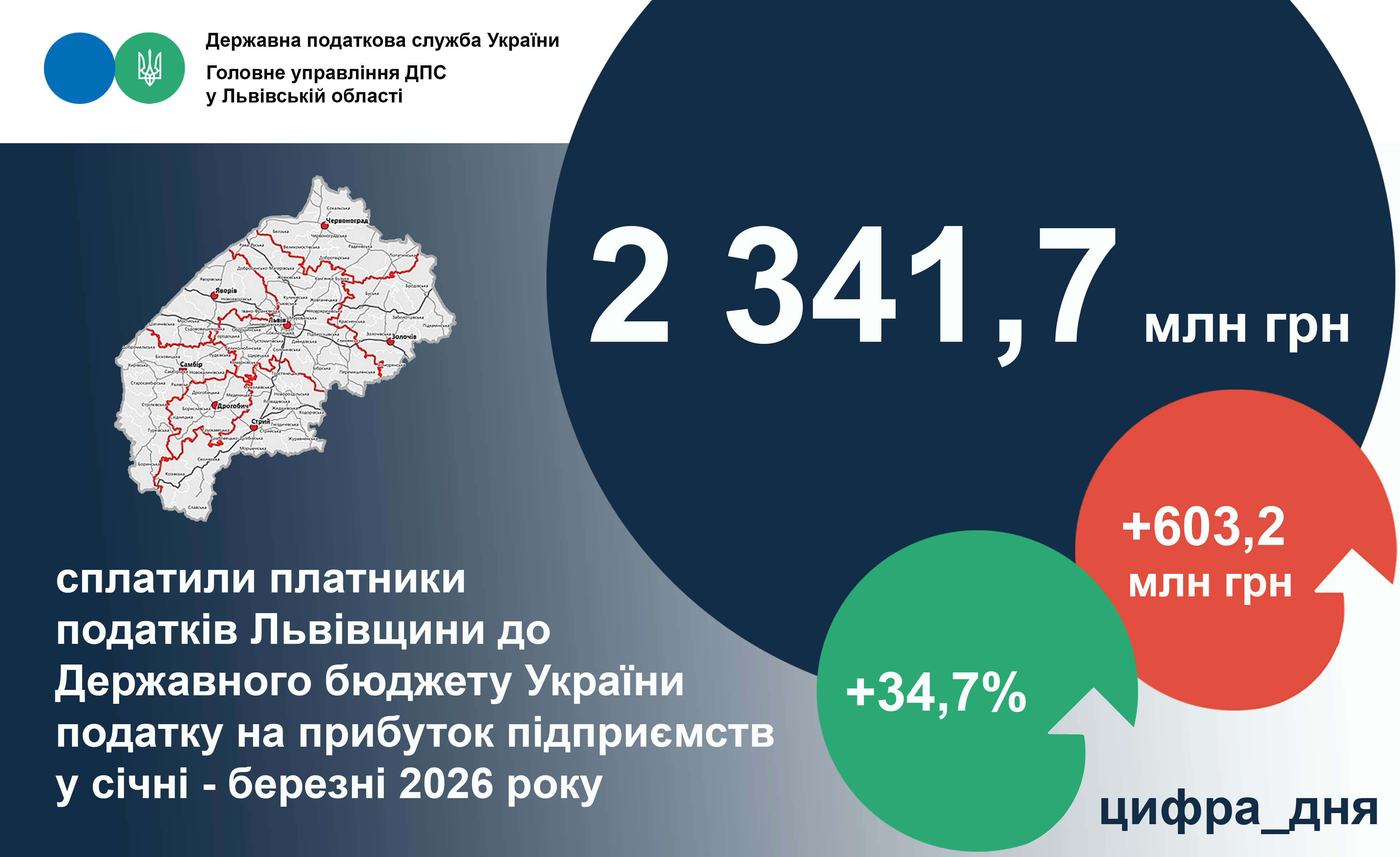 Податку на прибуток підприємств у січні-березні 2026 року надійшло до державного бюджету від Львівської області 2 341,7 млн гривень. Порівняно із січнем-березнем 2025 року надходження збільшились на 34,7% або на 603,2 млн гривень.
