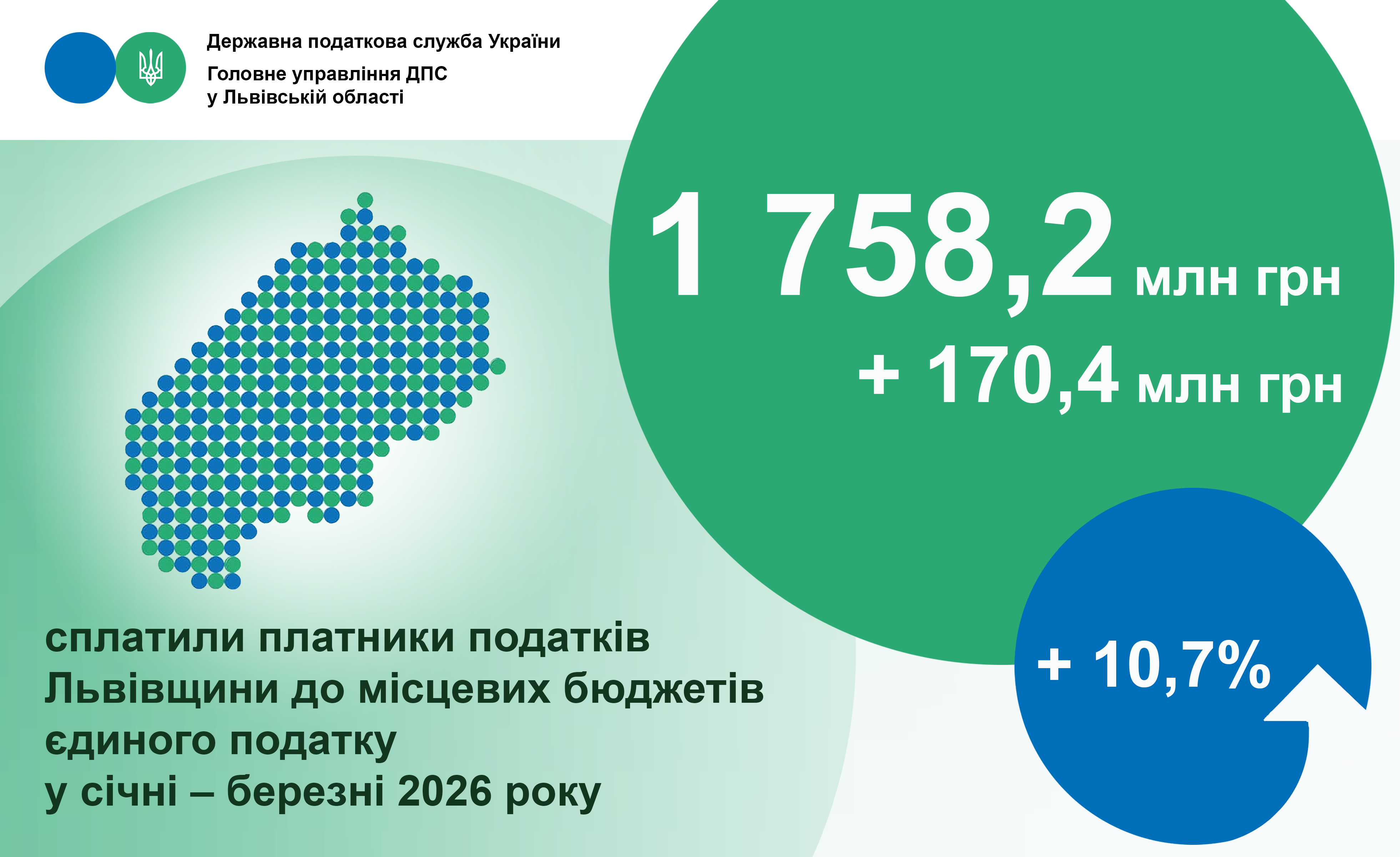 Упродовж січня – березня 2026 року надходження єдиного податку до бюджетів місцевих громад становили 1 758,2 млн гривень. Порівняно з відповідним періодом 2025 року вони збільшились на понад 10 відсотків або на 170,4 млн гривень.