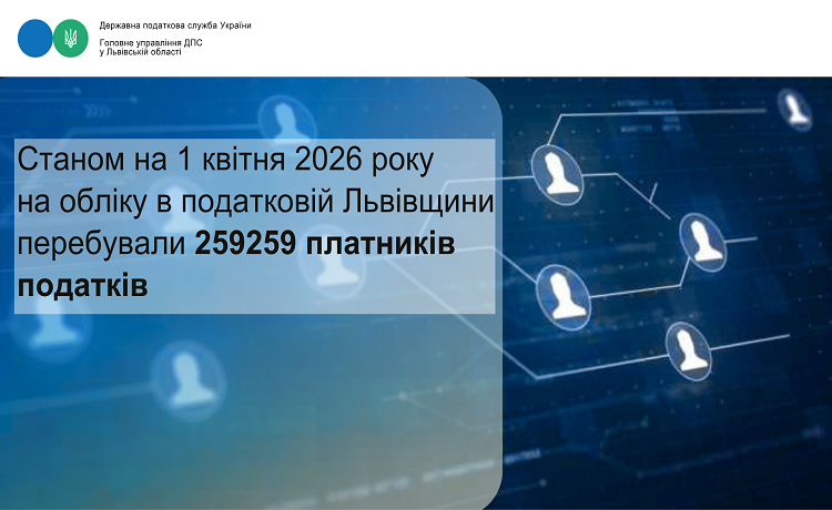 Таким чином, станом на 01.04.2026 в ГУ ДПС у Львівській області на обліку перебувало 259259 платників податків за основним місцем обліку, в тому числі: 98991 юридична особа, 158923 фізичних особи-підприємці і 1345 фізичних осіб, які провадять незалежну професійну діяльність та не є ФОП.