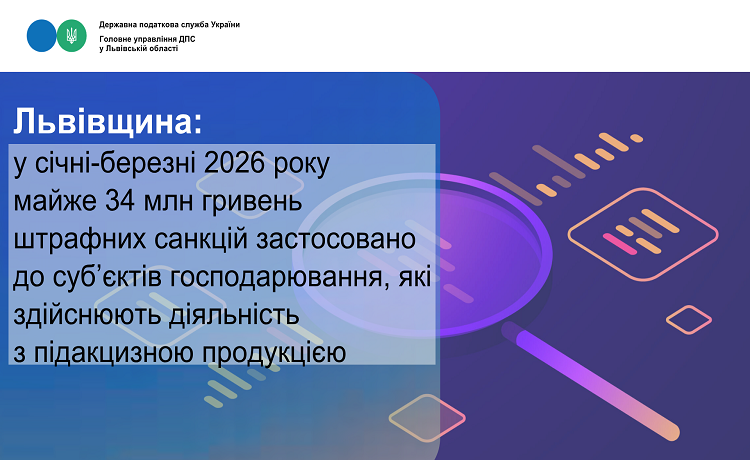 У січні-березні 2026 року за результатами проведених перевірок діяльності суб’єктів господарювання, які здійснюють діяльність з підакцизною продукцією, застосовано штрафних санкцій на загальну суму 33,6 млн гривень.