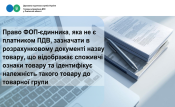 Відповідно до Закону України «Про застосування реєстраторів розрахункових операцій у сфері торгівлі, громадського харчування та послуг» із змінами та доповненням (далі – Закон № 265) фізичні особи – підприємці, які є платниками єдиного податку та не зареєстровані платниками податку на додану вартість, при продажу товарів (крім підакцизних товарів, технічно складних побутових товарів, що підлягають гарантійному ремонту, лікарських засобів, виробів медичного призначення, ювелірних та побутових виробів з дорогоцінних металів, дорогоцінного каміння, дорогоцінного каміння органогенного утворення та напівдорогоцінного каміння) або наданні послуг мають право в розрахунковому документі зазначати назву товару (послуги) у вигляді, що відображає споживчі ознаки товару (послуги) та ідентифікує належність такого товару (послуги) до товарної групи чи послуги.