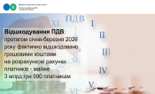 Протягом січня-березня 2026 року фактично відшкодовано грошовими коштами на розрахункові рахунки платників – 2 901,5 млн грн 590 платникам (в т.ч. 140,9 млн грн 135 ФОПам) проти 1 970,9 млн грн за аналогічний період минулого року.