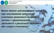 Тобто заява про анулювання реєстрації платника акцизного податку у зв’язку з припиненням діяльності з реалізації пального або спирту етилового подається за формою заяви про реєстрацію платника акцизного податку з реалізації пального або спирту етилового та/або акцизних складів, затвердженої наказом Міністерства фінансів України від 27.11.2020 № 729.
