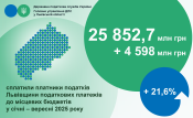 Упродовж січня-вересня 2025 року надходження податкових платежів до місцевих бюджетів становили 25 852,7 млн гривень. Порівняно з вереснем 2024 року надходження податків зборів та інших обов’язкових платежів, що контролюються Головним управлінням ДПС у Львівській області до місцевих бюджетів області збільшились на 21,6% або на 4 598,0 млн гривень. Про це повідомив начальник Головного управління ДПС у Львівській області Микола Никитюк.