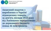 У вересні 2025 року до загального фонду державного бюджету акцизного податку з вироблених в Україні підакцизних товарів надійшло 7,5 млн гривень, або 131,1 % доведеного завдання (додатково надійшло 1,8 млн гривень). Порівняно з аналогічним періодом минулого року надходження збільшились на 65,6 % або на 3,0 млн гривень. Про це повідомив начальник Головного управління ДПС у Львівській області Микола Никитюк.