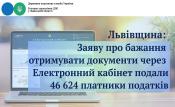 Станом на 01 жовтня 2025 року Заяву про бажання отримувати документи через Електронний кабінет подали 46 624 платники податків Львівщини (станом на 01.10.2024 – 11 907). Із них: 41 957 платників податків - суб’єктів господарської діяльності (18 відс. СГД Львівщини, за виключенням тих, які перебувають в процесі припинення) та 4 667 громадян.