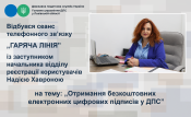 Відбувся сеанс телефонного зв'язку “гаряча лінія” з заступником  начальника відділу реєстрації користувачів Надією Хавроною на тему: “Отримання безкоштовних електронних цифрових підписів у ДПС”