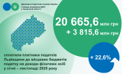 Упродовж січня – листопада 2025 року платники перерахували до місцевих бюджетів Львівщини 20665,6 млн грн податку на доходи фізичних осіб. Порівняно з відповідним показником минулого року надходження збільшилися на 22,6 %, або на 3815,6 млн гривень.