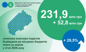 Надходження плати за землю у січні 2026 року становили 231,9 млн гривень. Порівняно з відповідним періодом 2025 року вони збільшилися на 29,5% або на 52,8 млн гривень.