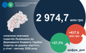 У січні-лютому 2026 року Головним управлінням ДПС у Львівській області до загального фонду державного бюджету України зібрано 7 936,7 млн грн податків, зборів, інших обов’язкових платежів. Порівняно з січнем-лютим 2025 року збір платежів до загального фонду державного бюджету збільшився на 34,3% або на 2 027,4 млн гривень.