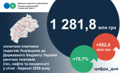 Рентних платежів (газ, нафта та конденсат) у січні-березні 2026 року надійшло до державного бюджету від Львівщини 1 281,8 млн грн, що на 75,7% або на 552,4 млн грн більше порівняно з січнем-березнем 2025 року.